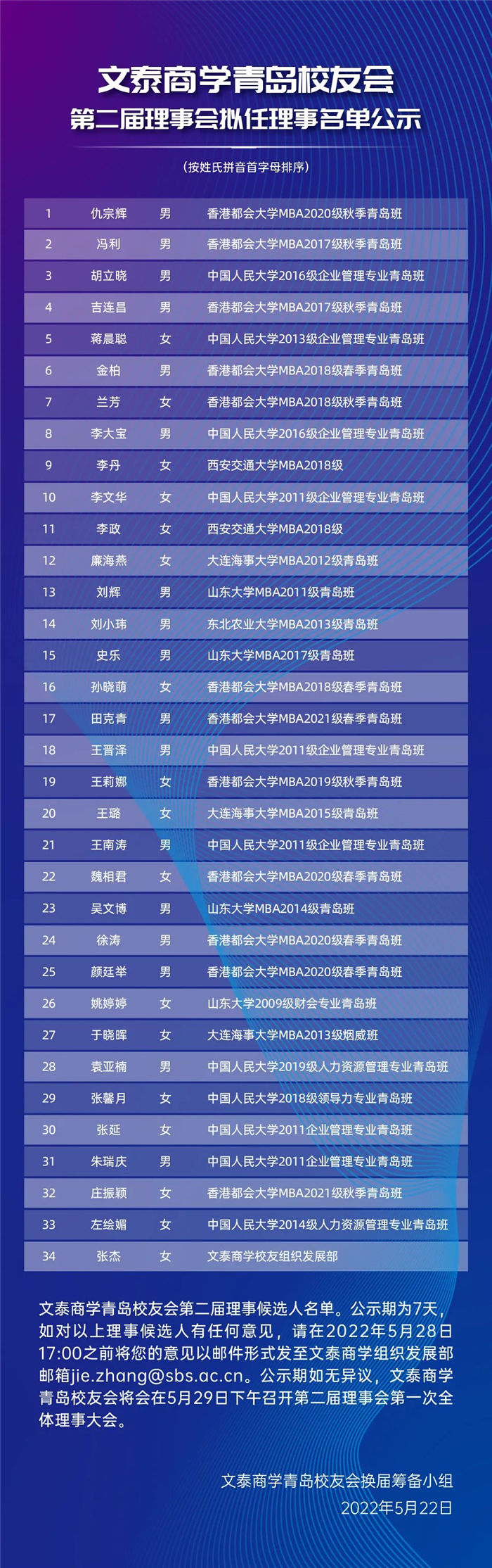 5. 5月20日将34位新一届理事会理事候选人名单上报文泰校友组织发展部并已得到批复,现向全体校友发布文泰青岛校友会新一届理事会理事候选人名单公示。