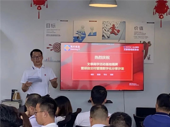 9月16日,《项目交付管理数字化分享讲座》暨文泰青岛校友会七号校友活动基地揭牌仪式在青岛乾行信息技术有限公司顺利举行。文泰青岛校友会吉连昌会长,文泰青岛校友会刘辉、吴文博副会长,文泰青岛校友会田克青、王南涛理事,文泰校友组织发展部张杰经理,青岛乾行信息技术有限公司王远星总经理、包小明副总经理出席了本次揭牌仪式。