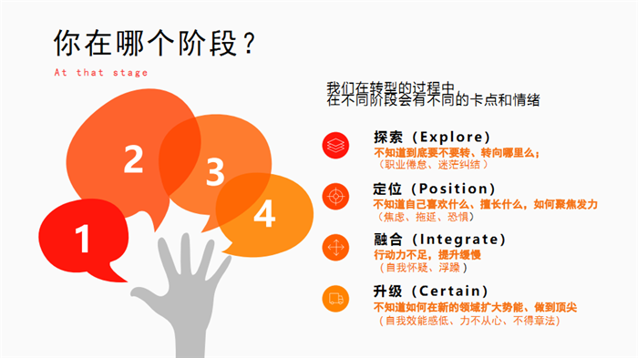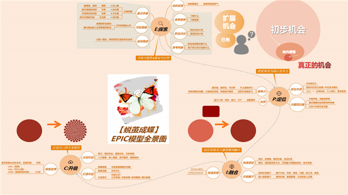 在书中,舒祺老师把重塑的过程归纳为四步,用这四步,在最短的时间走最适合你的路:探索→定位→融合→升级,称为EPIC模型。