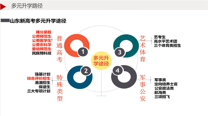 “但上阵要知己知彼。”王莉娜校友向家长们讲解了最新的山东升学政策,展示了多元升学路径。