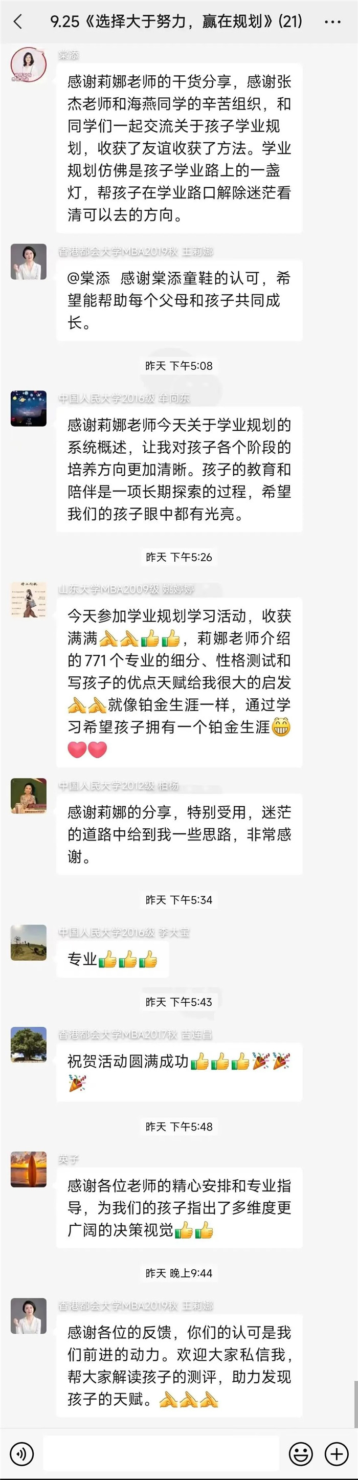王莉娜校友通过讲解真实案例,让校友们对孩子未来报考所面临的“专业定位”和“路径建议”等问题进行思考,把就业职业和学习专业匹配起来。