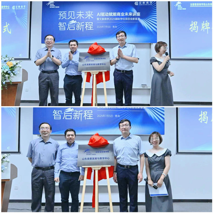 活动现场迎来重要的里程碑—— 法国雷恩商学院山东高管发展与教学中心成立揭牌仪式。在全体嘉宾的见证下,谈毅教授、雷恩中国高管发展与教学中心执行主任郑金师老师、文泰商学院院长范大鹏博士、法国雷恩山东高管发展与教学中心执行主任吴杰老师,为“法国雷恩商学院山东高管发展与教学中心”揭牌。该中心的成立,将进一步强化文泰整合海内外顶尖教育资源的能力,为山东及周边地区的企业高管提供更便捷、更优质的国际化学习与发展平台。